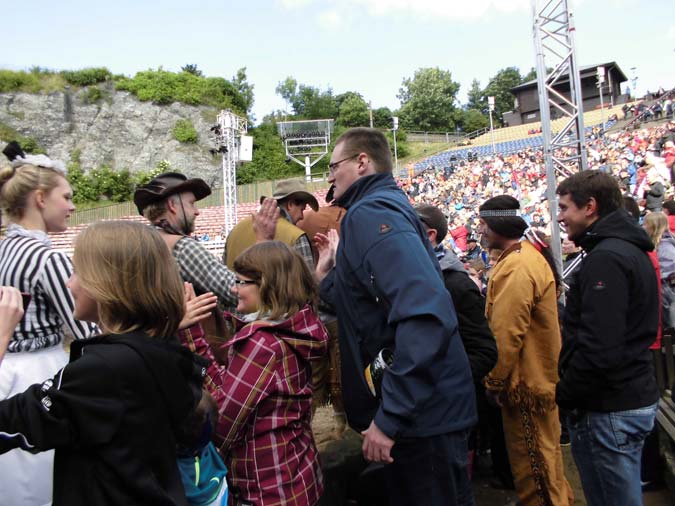 Dort versorgten sich alle mit Souvenirs, wie T-Shirts, Malbüchern und Programmheften, ehe die Plätze eingenommen wurden. Es folgte nicht nur Sonnenschein, sondern auch eine gewohnt aktionsreiche, aber auch witzige Vorstellung von Winnetou I mit Wayne Carpendale, dem ehemaligen Landarzt aus Dekelsen. Nach der Pause gelang es Malte, Oli und Marita sogar, Plätze in der ersten Reihe zu ergattern und dabei Winnetou und Old Shatterhand noch näher zu sein. Die Drei klatschten nach der Vorstellung mit allen Schauspielern per Handschlag ab, und Maltes Freude kannte keine Grenzen.
